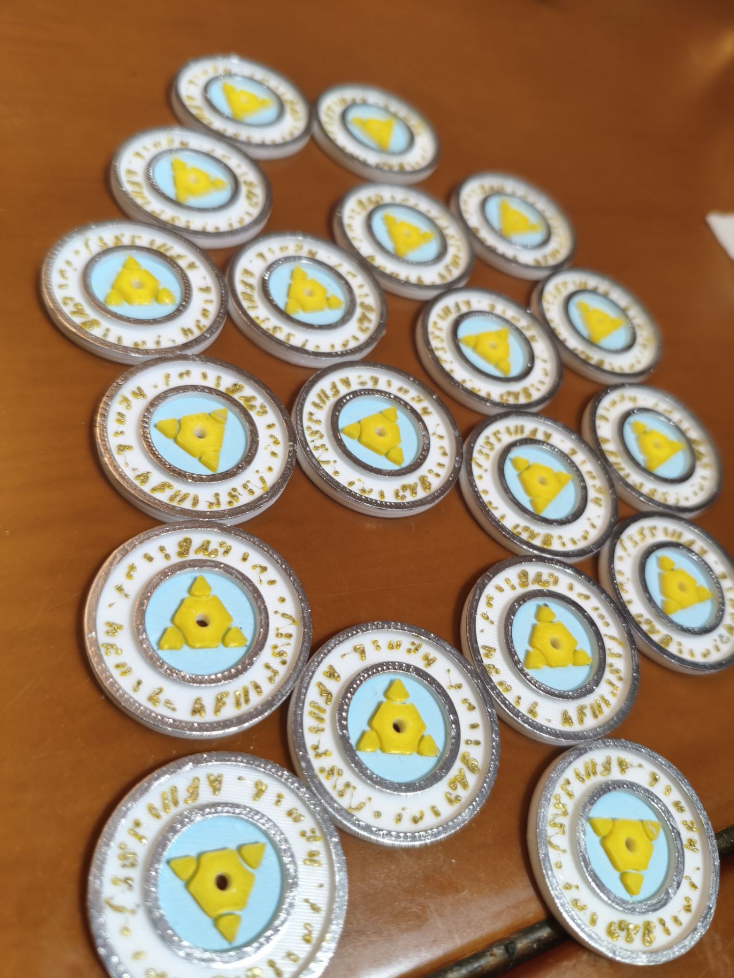 创意作品桌游代币(指示物)桌游指示物;FDM 多色一体打印,PLA,银色油漆笔涂装;2025年1月完成。作品展示:视频展示:作品来源桌游中作为标记的指示物。2025年1月设计完成。制作方式FDM 多色一体打印;材料 PLA;银色细节使用油漆笔涂装。